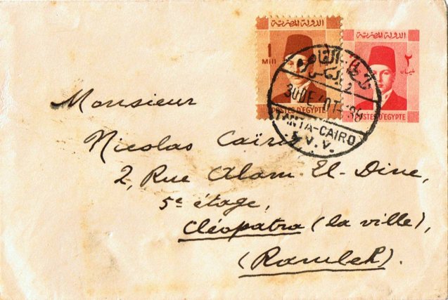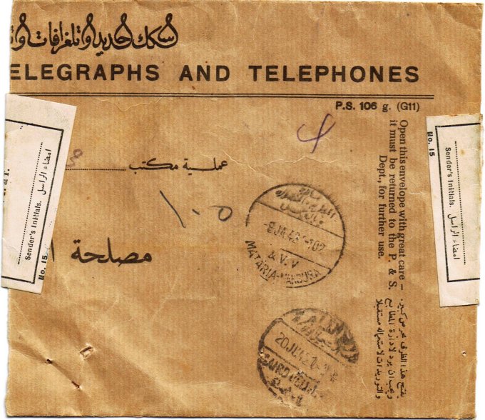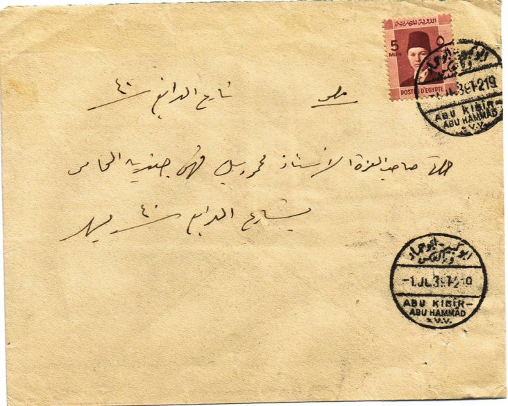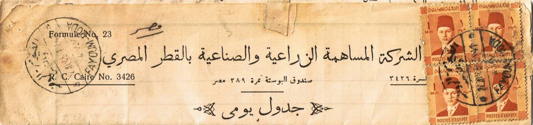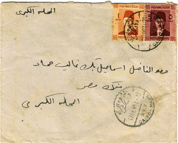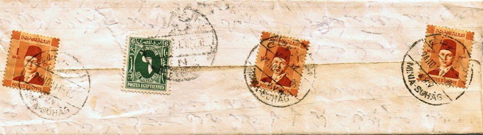 | 726 | 5 I 27 Samalut-Daquf Rural Service cover to France with strip of 3x5m First Fuad | £3.00 |