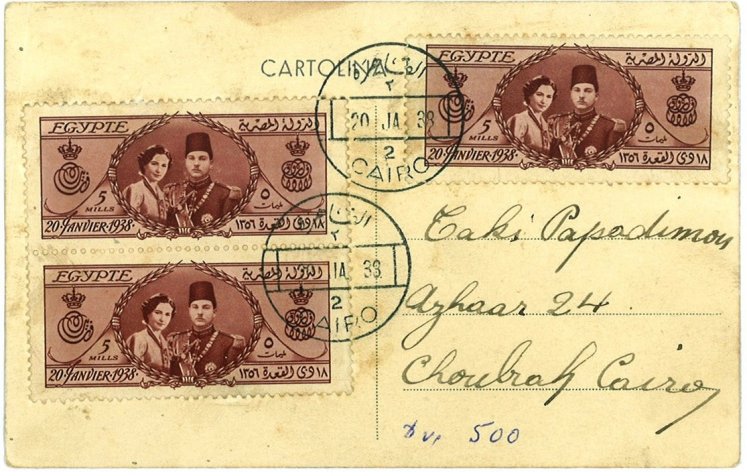 | 764 | 1936 King Fuad Army Post 3m, and 10m as issued (2 cards) | £30.00 |