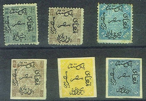 | 736 | 1866, First Issue. Six stamps, three perforated – 5para (wmk 1c), 10para (wmk 1b), 20 para (wmk 1a); and three imperforate proofs: 10pa (wmk 1a), 2pi (no wmk), 210pi (no wmk). All mint with minor hinge remains  | £80.00 |