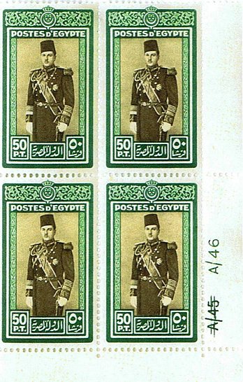 | 739 | 1937, Young Farouk – corner block of four 50pi green with control A/45 A/46 (Bal D153). Pristine condition  | £60.00 |