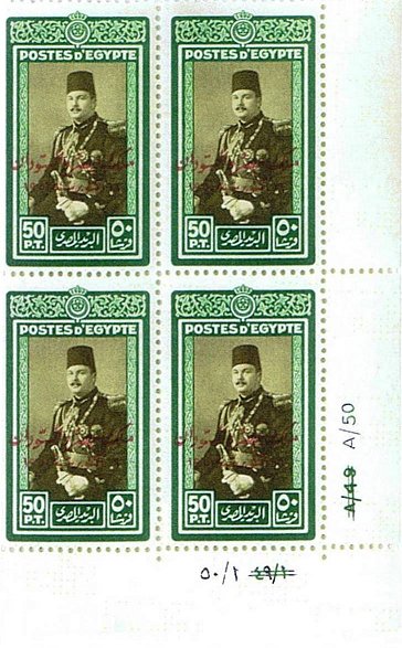 | 742 | 1952, Farouk Marechal, corner block of four of 50pi with “King of Egypt and Sudan” in dull red rose. Control block A/49 A/50 in both Arabic and English. Pristine condition  | £85.00 |