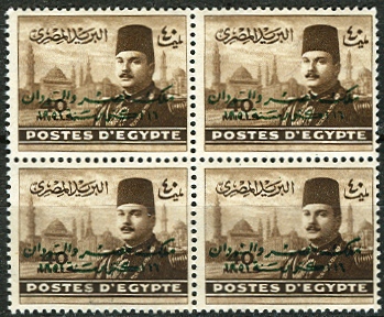 | 748 | 1952 "King of Egypt & Sudan" 40m block of four with green (instead of red) colour trial MNH; each has Arabic 'Qubbah Palace' on the back. Only 100 stamps exist and blocks are almost impossible to find  | £75.00 |