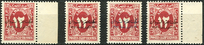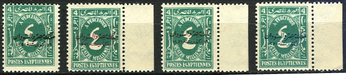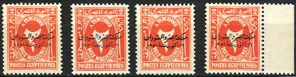 | 750 | 1952 "King of Egypt & Sudan" 4 different colour trials of the 4m postage due MNH (including adopted blue colour); each has Arabic 'Qubbah Palace' on the back. Only 100 of each exist  | £75.00 |