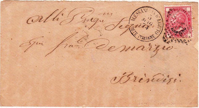 | 2 | Italian - 5 MY 74 - Alex-Brindisi. Franked 40c Estero cancelled by 234 in retta with Italian Post Office CDS for 5 May alongside. Brindisi backstamp indicates three days to travel 1450km  | £27.00 |