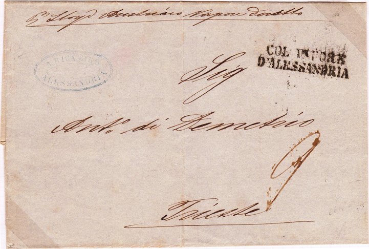 | 3 | Austrian - circa 1858 - pre-stamp letter sheet sent "per Lloyd Austriaco Vapour", the two-line Col Vapore d’ Alessandria applied at port of destination to indicate port of origin. The script 9 is odd - the rate should have been 10 soldi, equivalent of 1 kreuzer  | £28.00 |