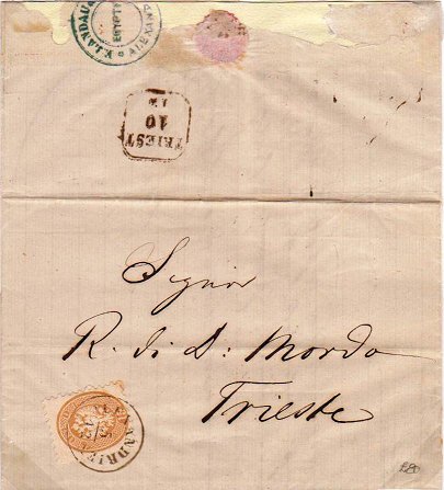 | 4 | Austria - 5 December 1864 - Alex-Trieste. Austrian 15s adhesive (SG 49) cancelled with clean Alexandrien cancel of 5/12. Reverse carries double-ring sender’ s cachet in blue-green, and rectangular boxed Trieste 10/12 arrival. Top of reverse expertly repaired  | £35.00 |