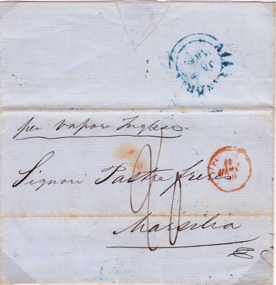 | 5 | British - 8 JA 56 - Alex-Marseilles. Endorsed "per vapore Inglesi" and sent at 90 cent rate (manuscript), Alex double-ring in blue, French packet mark in red for Jan 11. Receiver endorsed letter as arriving Jan 16, eight-day transit  | £30.00 |