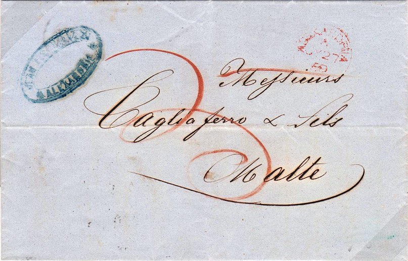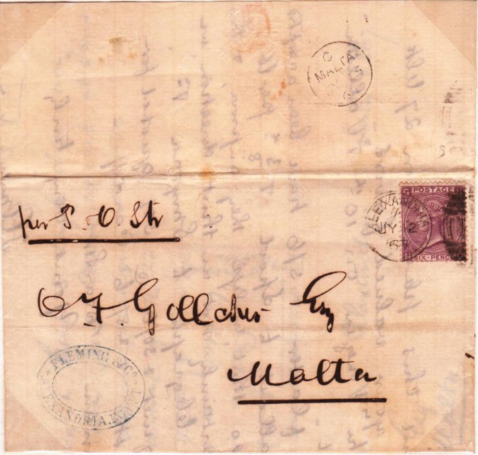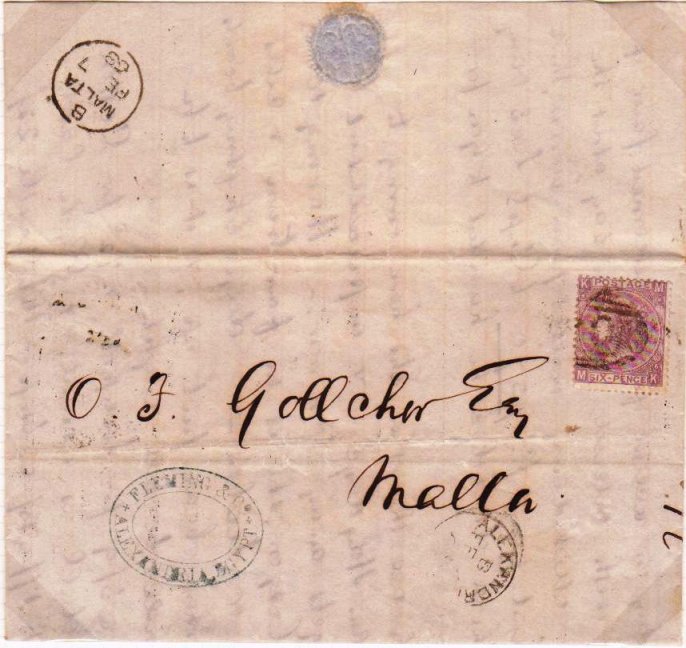 | 9 | British - Alex-Malta. Folded letter franked Victoria 6d lilac, plate 6, cancelled by small B01 obliterator with Alex thimble CDS alongside. Malta receiver indicates three days for delivery  | £26.00 |