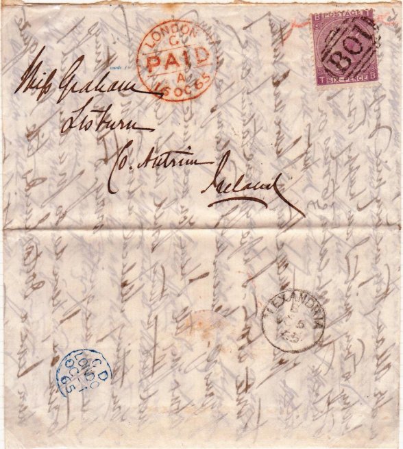 | 7 | British - 5 OC 65 - Alex-Ireland, franked Victoria 6d lilac, plate 5, white letters, cancelled small B01 oval, with single-ring Alex behind. London thimble and London Paid 15 OC 65, but no receiving mark on arrival in Co Antrim  | £30.00 |