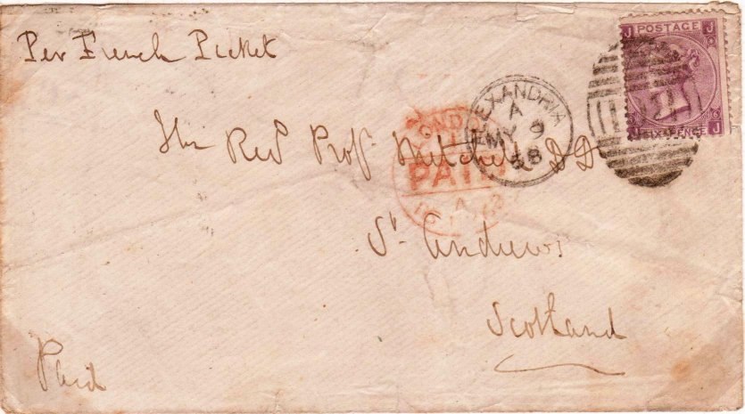 | 10 | British - 9 MY 68, long envelope franked with Victoria 6d lilac (with hyphen), Plate 6, large white letters, endorsed "By French Packet" for Scotland and cancelled by inverted Alexandria 10-bar duplex. London Paid 16 May, and St /Andrews arrival (behind) next day  | £26.00 |