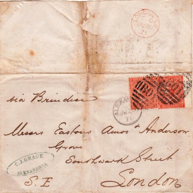 | 11 | British - 20 JU 71, franked for London with two Victoria 1870 4m vermilion, Plate 12, cancelled by upright eight-bars B01 and with Alexandria CDS of 20mm alongside. London receiving mark in red 28 June  | £25.00 |