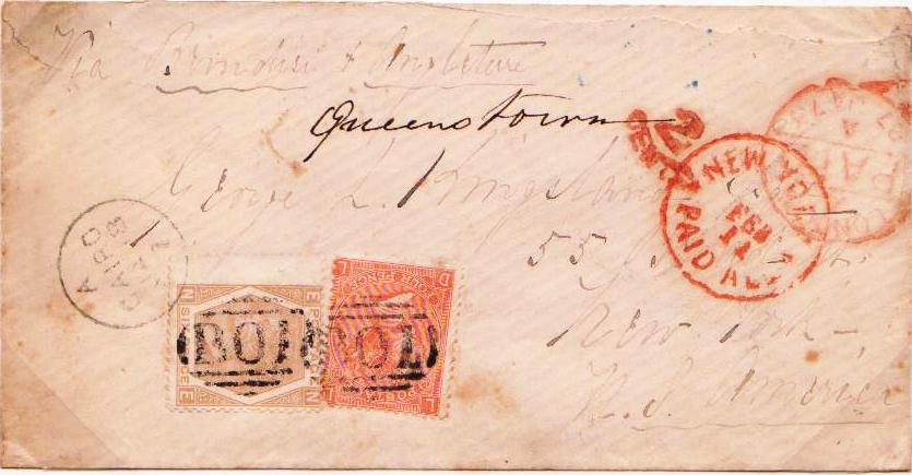 | 12 | British - 18 JA 73 - Cairo-New York. Victoria 4d (SG 94) and 6d (SG 123) adhesives on cover to New York, both with rarely seen B01 obliterators of Cairo (see Smith p.66), and 6d also cancelled with A / Cairo thimble cds of JA 18. London Paid mark in red Jan 27, and New York arrival Feb 11 with 2 Cents due mark also applied. Odd and unusual  | £45.00 |