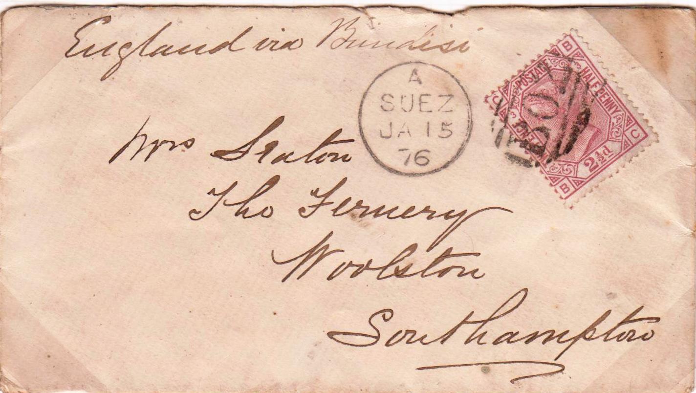 | 13 | British - 15 JA 76, small envelope franked 1873 Victoria 2½d mauve (SG 141) for Southampton, endorsed "England via Brindisi" and illustrating use of B02 canceller in Suez  | £26.00 |