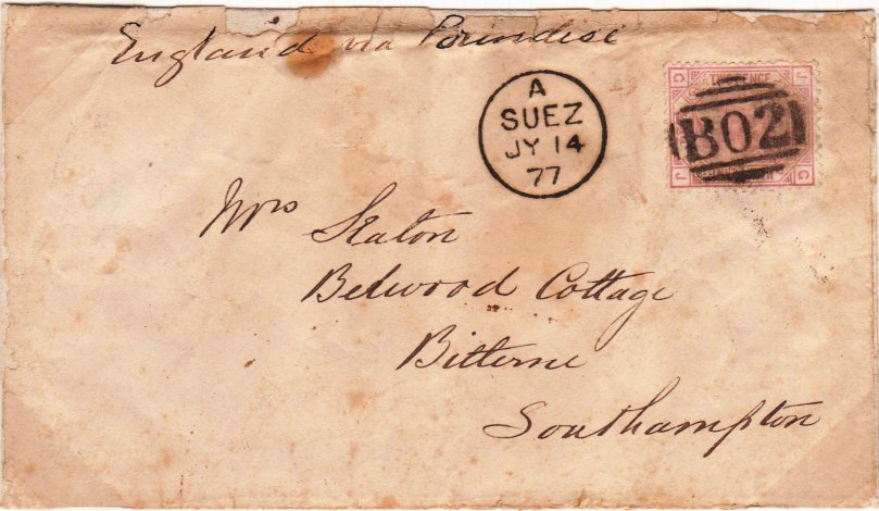| 14 | British - 14 JY 77, small envelope franked 1873 Victoria 2½d mauve (SG 141) for Southampton, endorsed "England via Brindisi" and illustrating use of B02 canceller in Suez  | £28.00 |