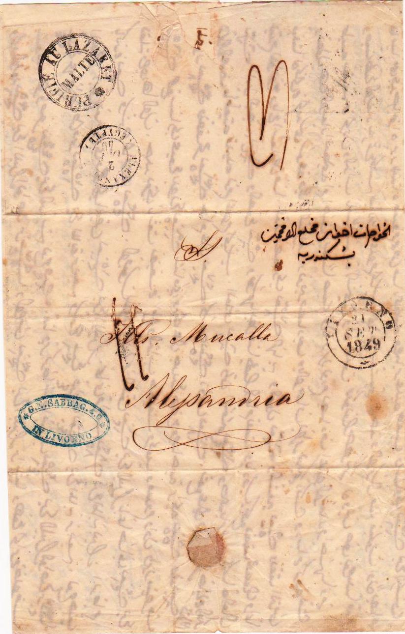 | 15 | 2 OC 1849, folded letter to Alexandria cancelled double-ring Livorno CDS 21 Set 1849 with superb circular Purifie au Lazaret / Malte (Martin Type Laz-C4) and double-ring French office Alexandrie / Egypte arrival on reverse  | £45.00 |