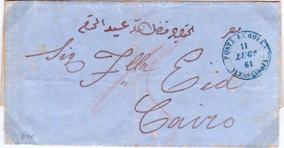 | 16 | 11 Jul 1861, folded letter addressed in Arabic and Italian, posted in Alexandria for Cairo with excellent strike in blue of Posta Europea Alexandria Type IV, the first circular Posta Europea cancellation introduced only in January. Red manuscript marking on face, no backstamps  | £35.00 |