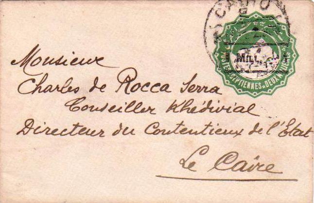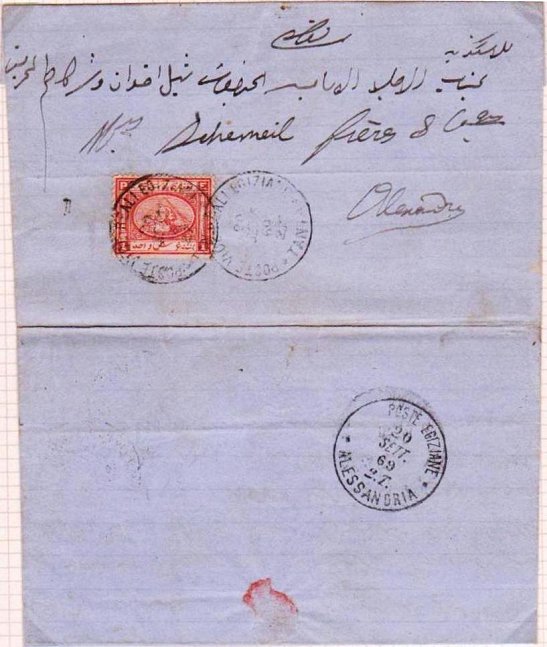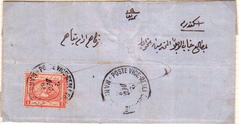 | 21 | 20 Sep 69, entire from Tanta to Alexandria, franked 1pi (Type IV) of the 1867 issue cancelled Post Vice Reali Egiziane. By the time, same day, that it arrived in Alex the instruction to remove the "Vice Reali" had been acted upon!  | £40.00 |