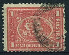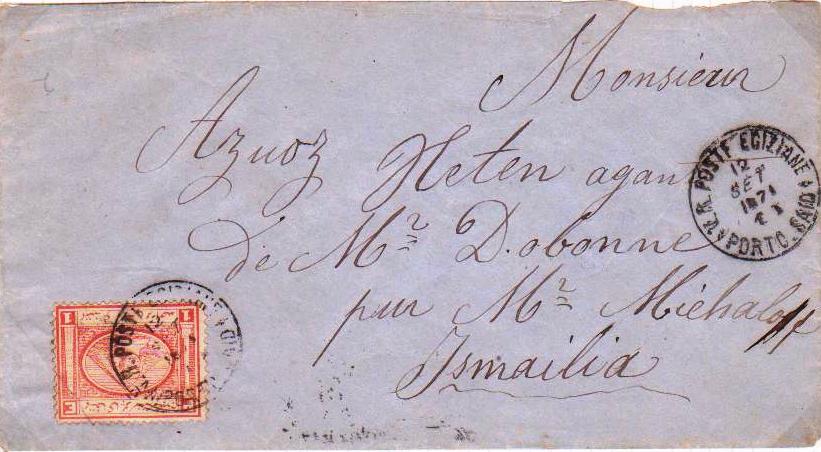 | 22 | 12 Sept 71, small envelope addressed to Ismailia, franked with 1867 1pi (Type IV) and cancelled V.R. Poste Egiziane of Port Said. Backstamp of Ismailia is same type, same day  | £30.00 |