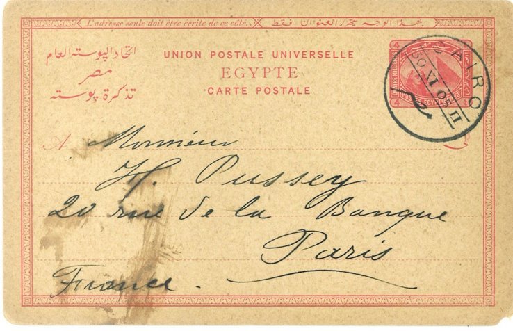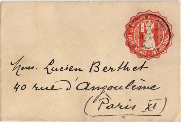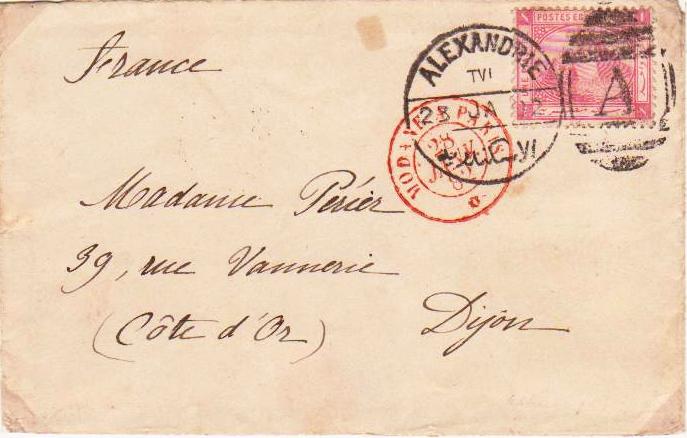 | 23 | 23 Jan 1882 - small cover addressed to Dijon franked with 1pi DLR pale rose of the 1978-82 issue tied with clean Alexandrie / A duplex. Modane a Paris struck in red five days later, and part Dijon arrival behind  | £20.00 |
