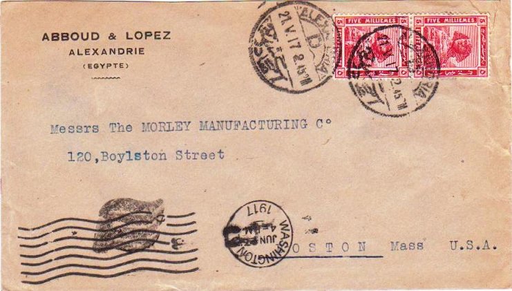 | 25 | 21 VI 17, extravagant printed business envelope, addressed to Boston and franked pair of 5m DLR pictorials. Alex / D CDS and wartime wavy-line censor, no backstamps  | £6.00 |