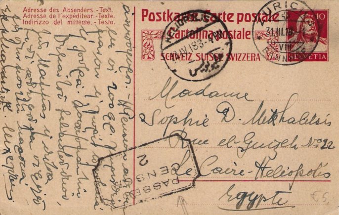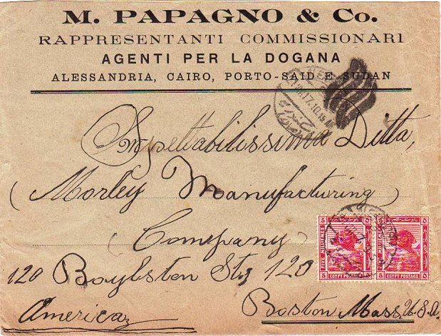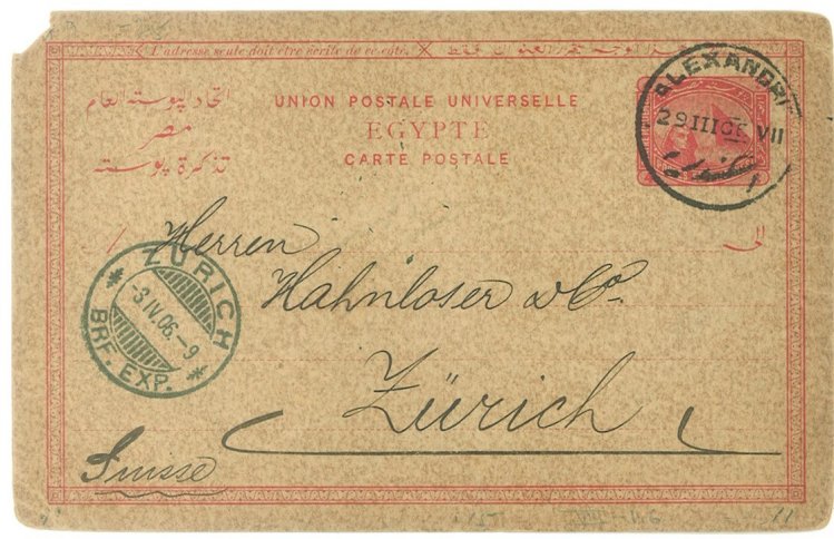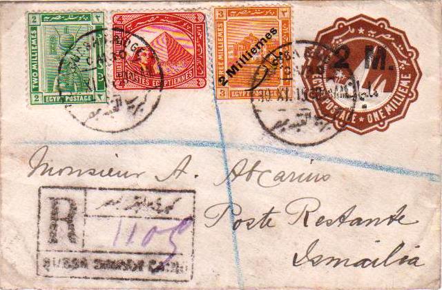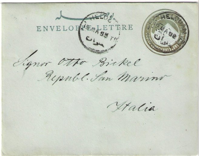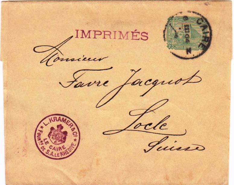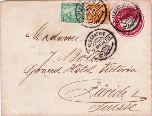 | 521 | 9 III 04, 5 mills p.s envelope (NP SEN6) uprated with pleasing colour combination of 2,3m DLR (SG 59,61), all cancelled with Alexandria / Station CDS for Zurich (arrival behind)  | £12.00 |