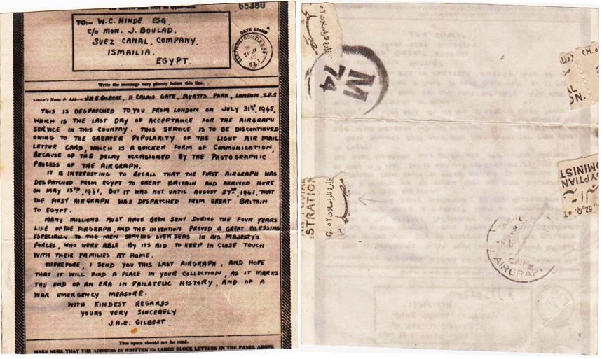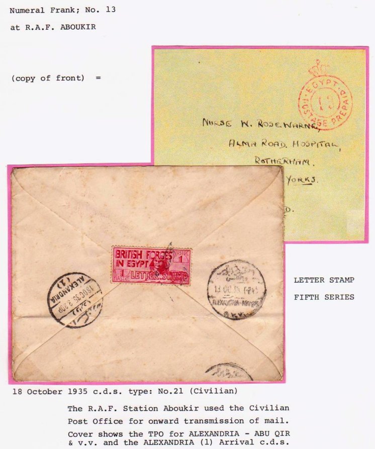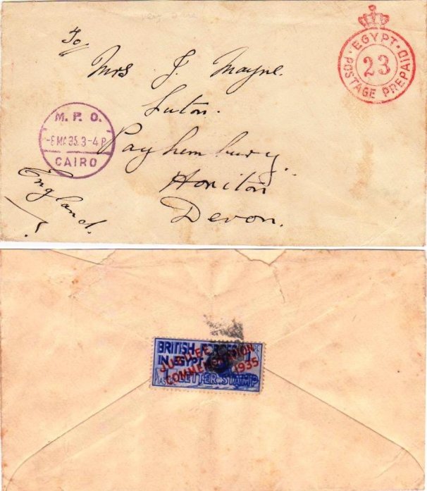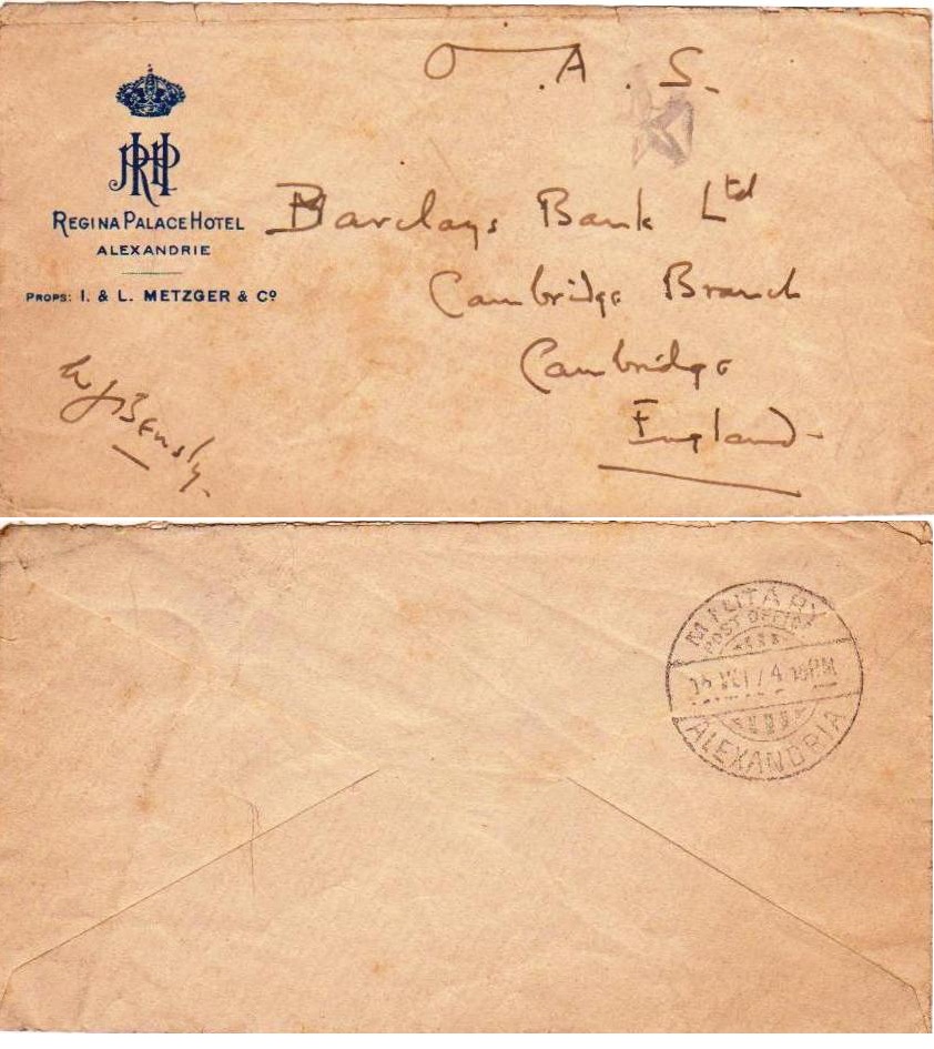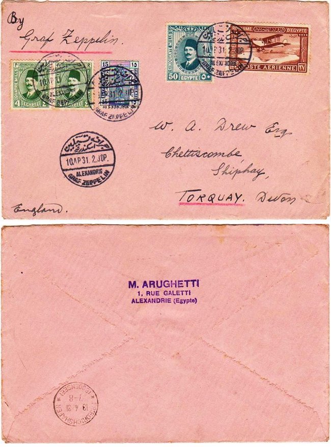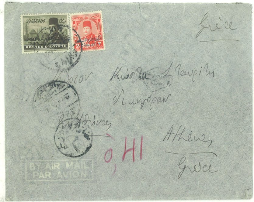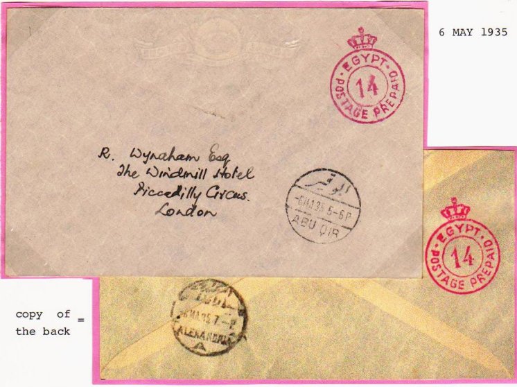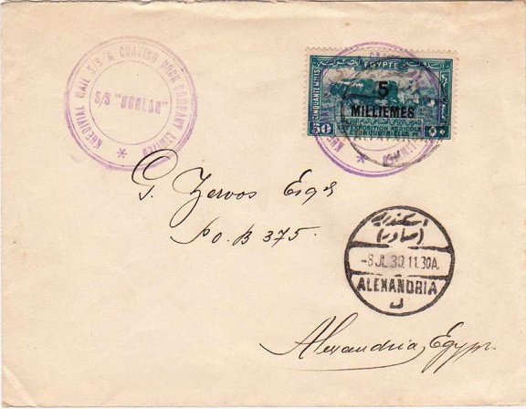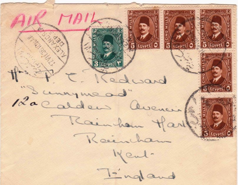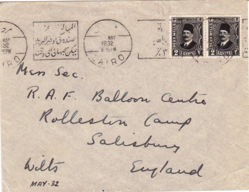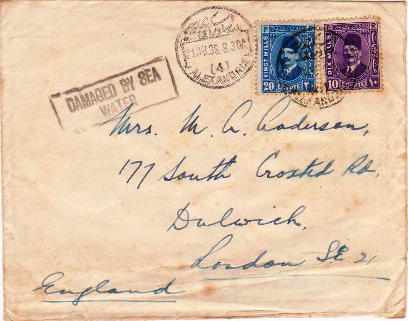 | 81 | 1936, cover addressed to London, franked Fuad 10m+20m cancelled Alex 21 AU 36, with black boxed handstamp Damaged by sea / water. Saved from the wreck of the Scipio flying boat which crashed off Crete next day. Peter Goodwin page. Sought after  | £55.00 |