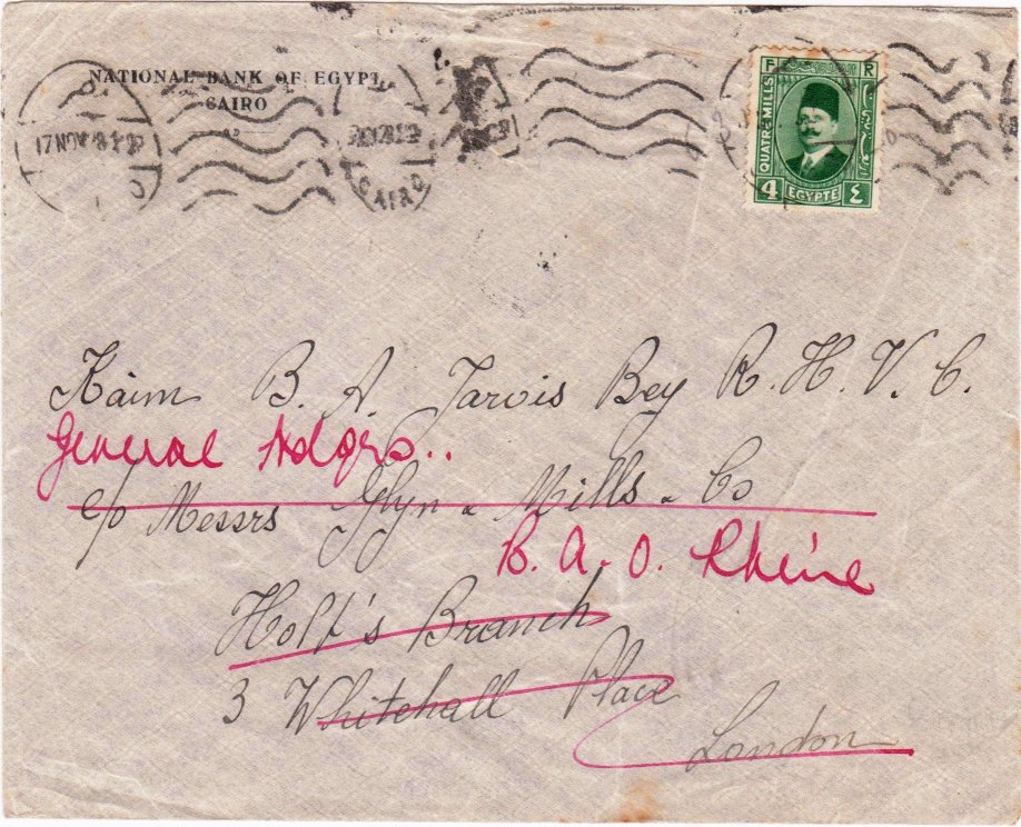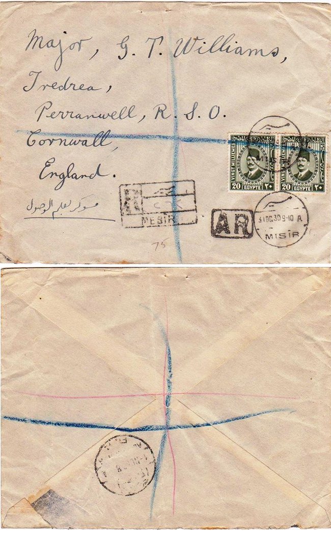 | 27 | 31 DE 30, plain cover franked pair of Fuad 20m (SG 163) for Registration and AR to Cornwall from Misir (NB Registration cachet spells Mesir). Faint Alex transit behind  | £5.00 |
