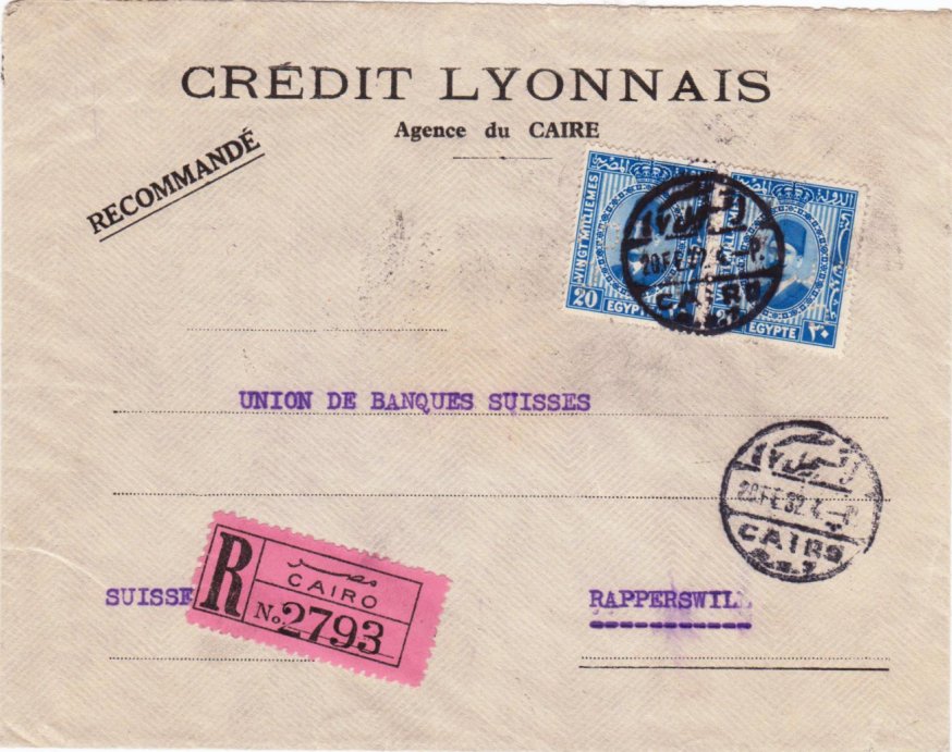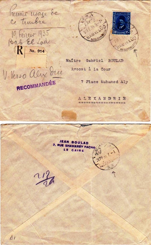 | 28 | 18 FE 35, plain cover Bab el Luq (Cairo) to Alexandria, franked solely Fuad small 20m blue (SG 162) covering postage and registration (mute R label on front and Alex arrival behind is Registered (RA) CDS). Annotated by Gabriel Boulad (addressee) as "first usage of this stamp", though SG and NP say it was issued 1934, and Magdi says Feb 1934!!  | £14.00 |