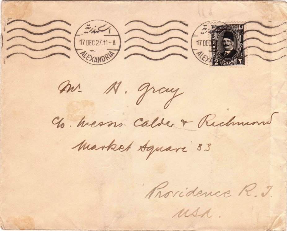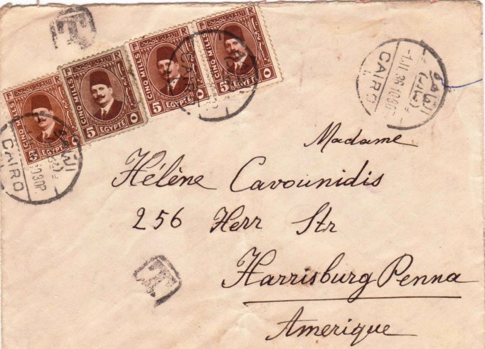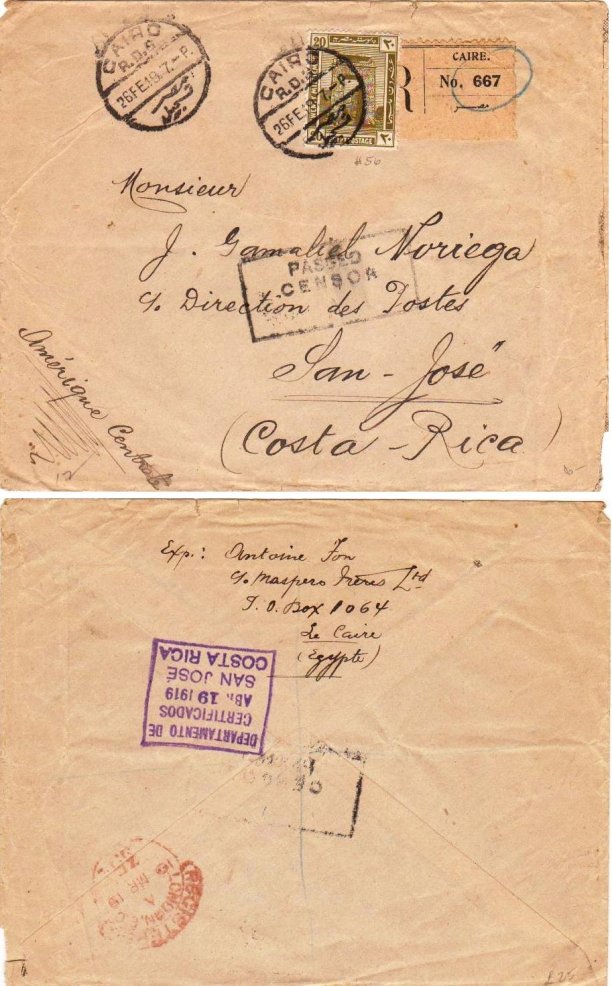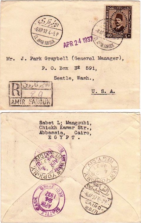 | 29 | 6 AP 37, clean small cover franked Fuad 40m (SG 165) for registration to Seattle from El Amir Farouk (Reg cachet omits the "El"). Excellent markings on face and one Cairo and four American behind. Neat  | £9.00 |