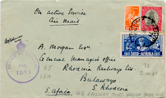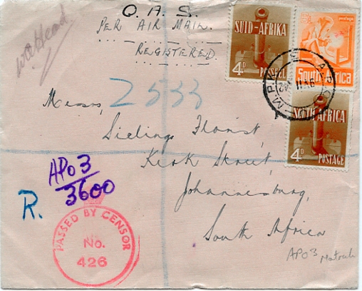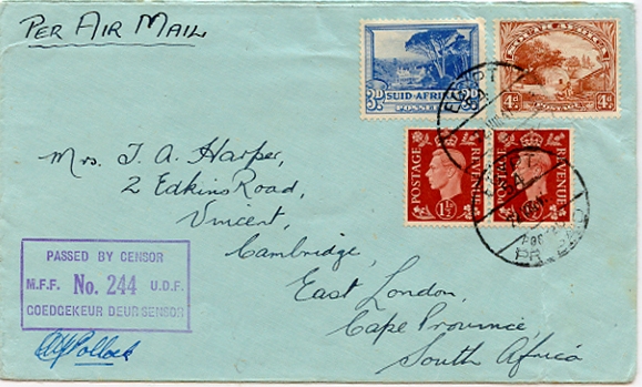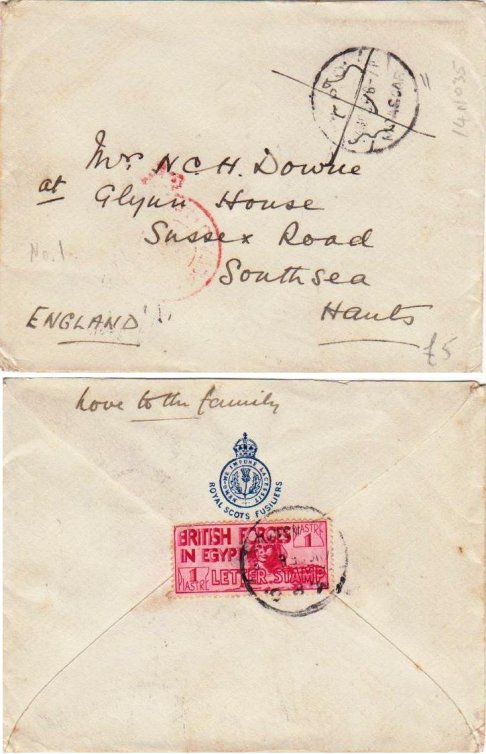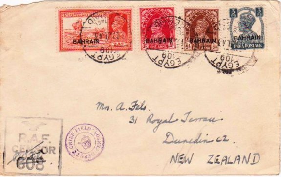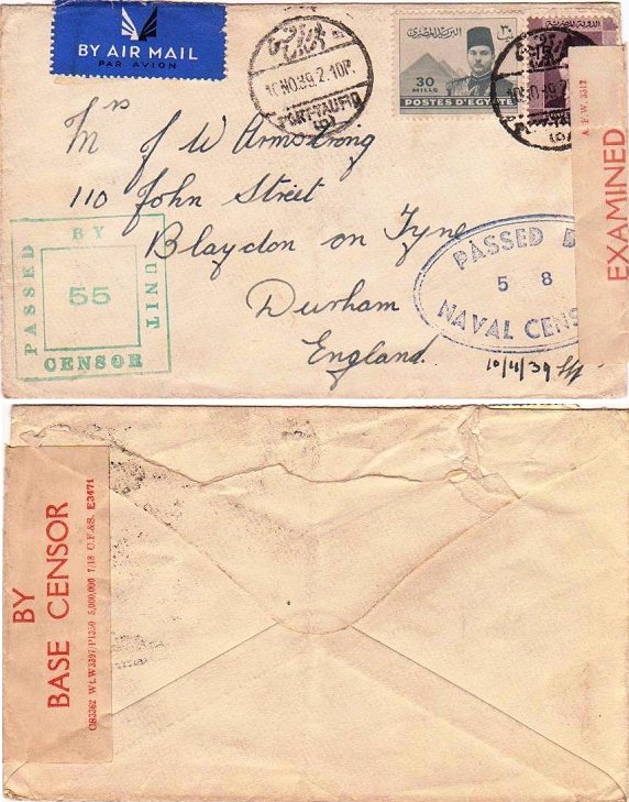 | 30 | 11 NO 39, cover with Air sticker franked 15m and 30m Boy King cancelled Port Taufiq for Durham. Attracted square Unit Censor 55 in green and Naval Censor 58 in oval as well as Base Censor resealing label. Interesting  | £8.00 |