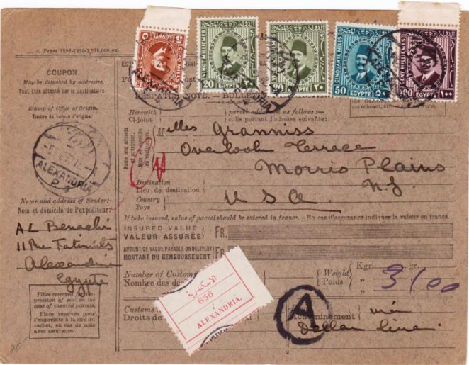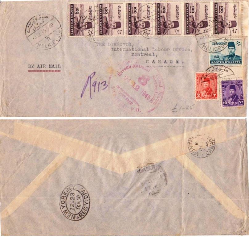 | 31 | 8 DE 45, long cover to Montréal astonishingly franked with strip of six 100m Farouk stamps as well as 2+10+50 for a total of 662m for Registered Air Mail. New York and Montreal CDS behind, Canadian Revenue Duty Free on face  | £10.00 |