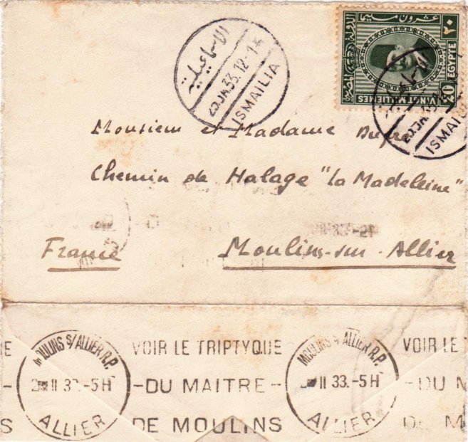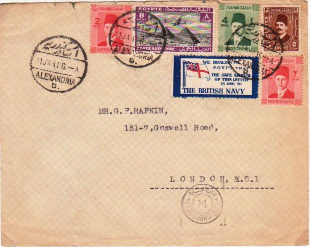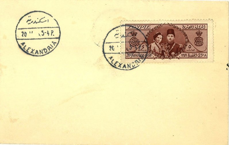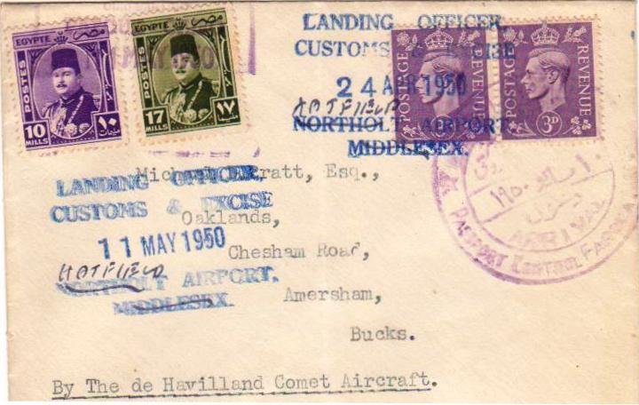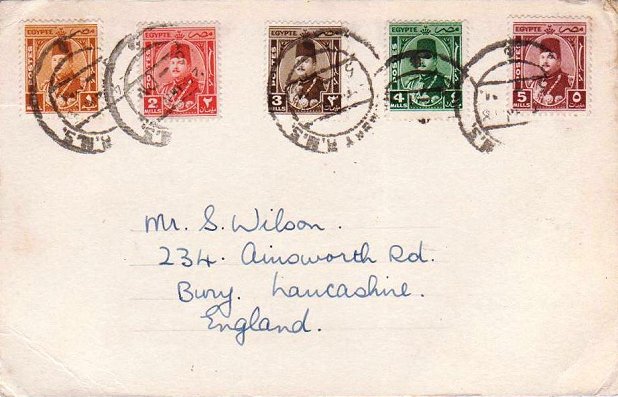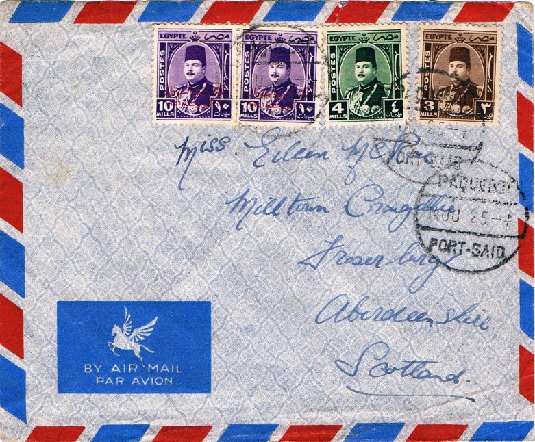 | 475 | Farouk Maréchal air cover franked with three colour definitives. Cancelled Paquebot Port Said 14 JU 52 (5 slug missing) to Fraserburgh  | £2.00 |