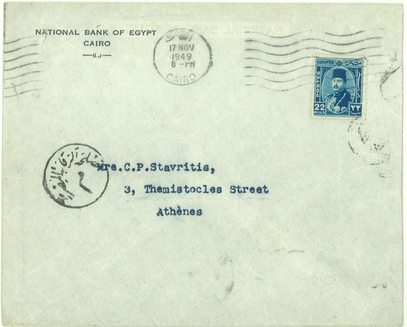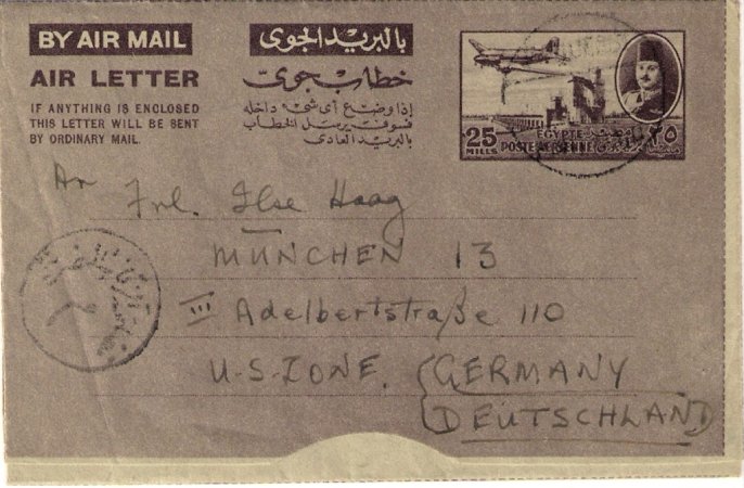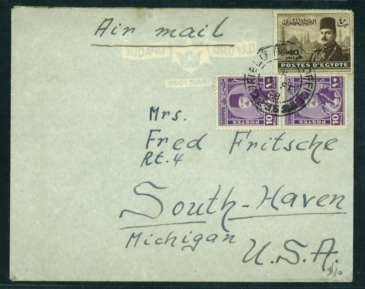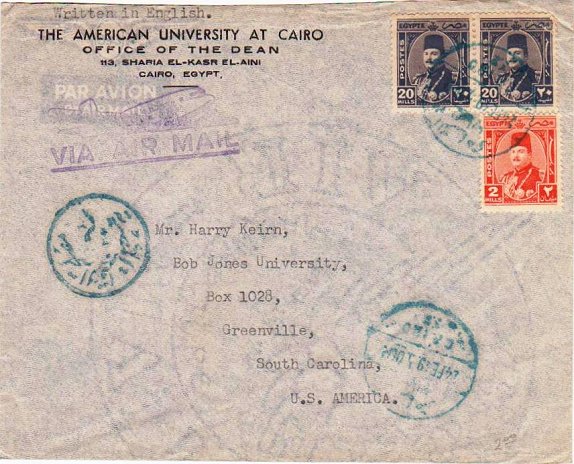 | 33 | 24 FE 49, flimsy air envelope printed for Office of the Dean, American University in Cairo, franked 2x20m+2m Marechal for Air Mail to USAS. Egyptian censor and faint Cairo CDS all in blue  | £6.00 |
