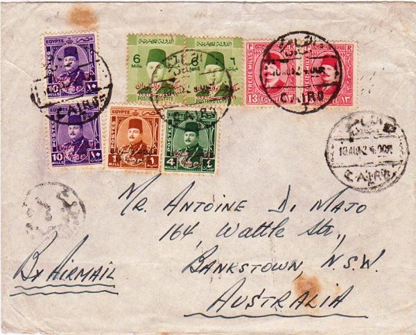 | 35 | 19 AU 52, plain cover endorsed Air Mail, franked pairs of Fuad 13m, Boy King 6m, Marechal 10m plus Marechal 1+4m for total 63m for Australia, all but Fuads with KES overprint. Sent from Cairo / T. Flap lost  | £4.00 |