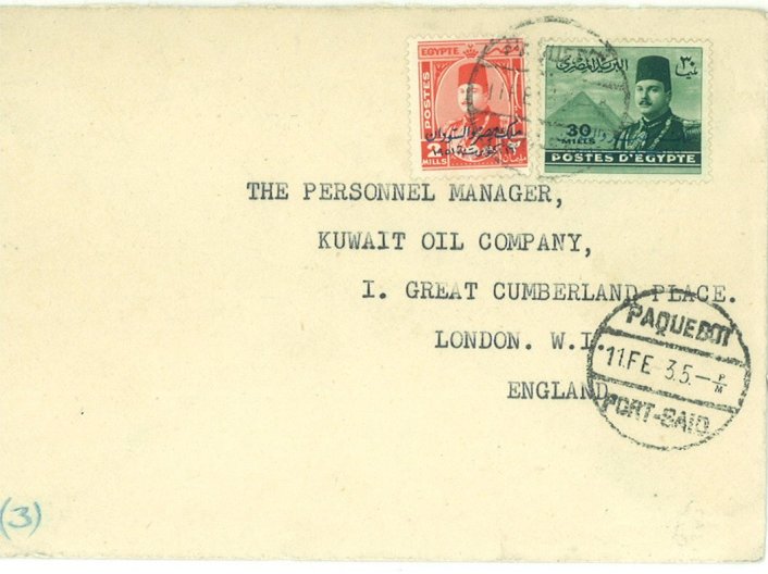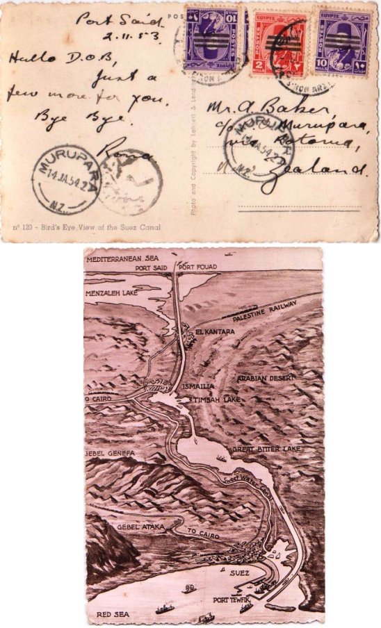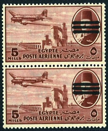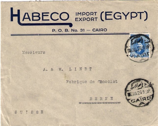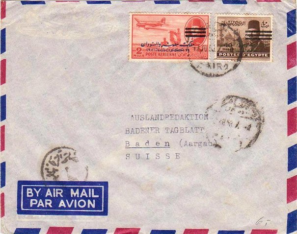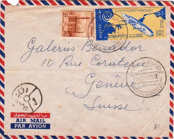 | 37 | 20 10 53, Air env addressed to Switzerland and franked 37m Republic definitive plus 10m Canal nationalism commemorative, cancelled with special Nationalisation handstamp for Port Said. Censor mark, no backstamp  | £8.00 |