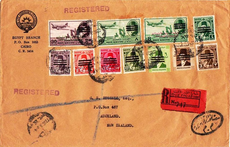| 38 | 27 OC 55, Sun Life Assurance envelope registered (Rue Fouad 1er black on red Reg label) to New Zealand with array of stamps, 2x8+30 Air Mail, 2,3,4,13,15,17 Marechal, 3,6m Boy King, all with Farouk barred, and four with KES overprint. Civil censor, no backstamps, neat and colourful.  | £10.00 |