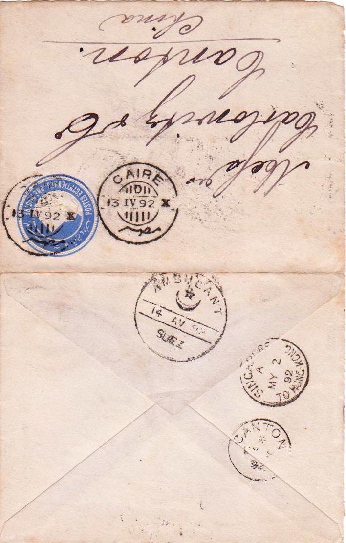 | 39 | 1888 1pi stationery envelope (NP SEN2a, Magdi E3), used from clear Cairo / D 13 IV 92 X and addressed to Canton, China. Opened for display to show Singapore-Hong Kong transit and Canton arrival marks behind with near-complete and very rare Suez Ambulant star/crescent CDS (TPO Type 2A2) of 14 AV 92. Staggering  | £125.00 |