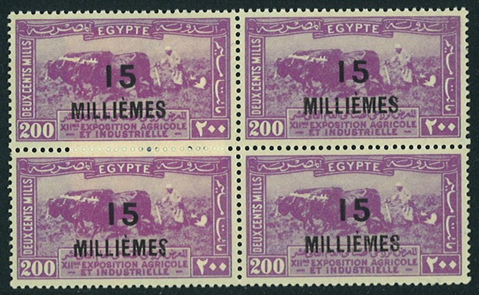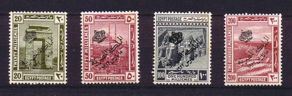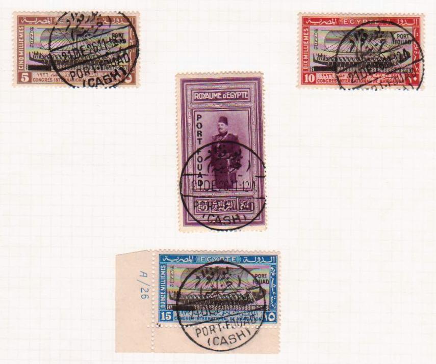 | 42 | 21 December 1926, Port Fouad set - three issues of Navigation Congress and King’ s Birthday stamps all overprinted Port Fouad to mark inauguration of new city (SG 141-44 £1700, NP C17-20 $1100, Magdi 14-17 $1350). All used with first day Port Fouad / Cash cancel, the lower values with pencil authentication behind. 15m control corner stamp shows guide crescent and tiny pinhole for overprinting. Beautiful set  | £650.00 |