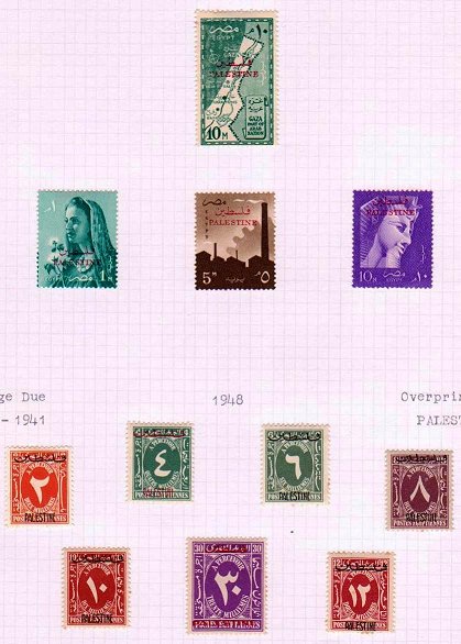 | 48 | 1948, 1927 Postage Due set, 2m-12m complete (SG D32-38 £13.50) with bilingual Palestine overprint, 7 stamps; plus 1957-58 Gaza Strip re-occupation (SG 87) and definitive set of three (SG 88-90), first with new opt style, 11 stamps, all clean mounted mint  | £3.00 |