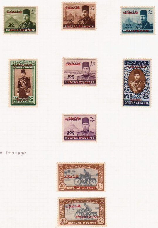 | 49 | 1948, Marechal definitives overprinted bilingual Palestine. Higher values, 30m-£E1 inclusive (SG 13-19, £90), plus two copies of overprint on 1944 40m Express stamp (SG E32), all clean mounted mint, 9 stamps  | £18.00 |