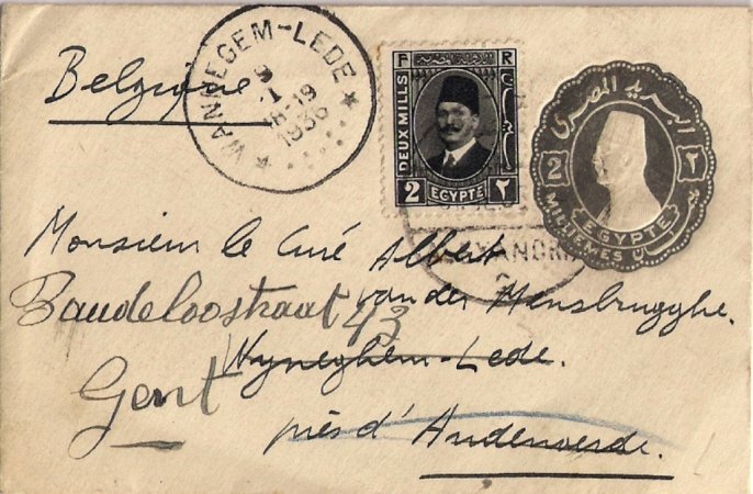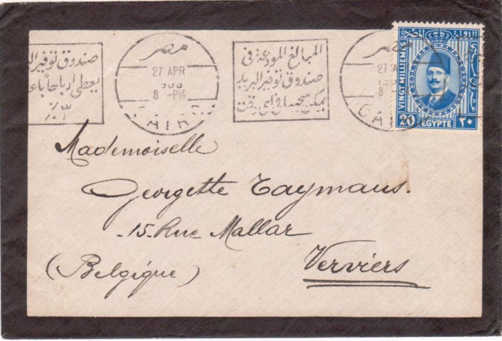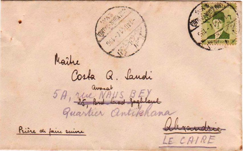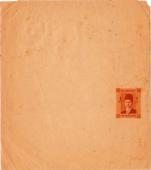 | 530 | 1 AU 41, small printed cover (flap) franked 6m Boy King from Abu Kibir to Alexandria and redirected to Cairo. Stamp cancelled TPO Abu Kibir-Salhia (Type 7A3.4). Alex arrival behind  | £12.00 |
