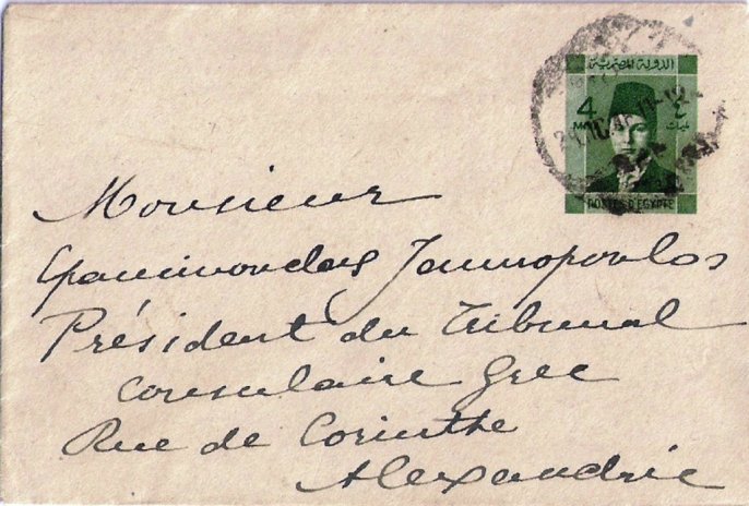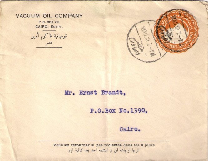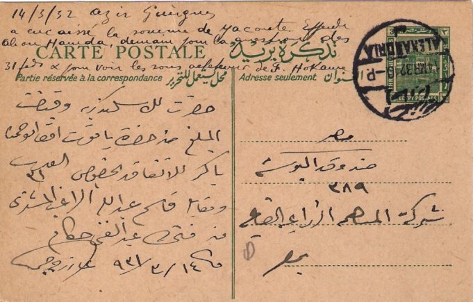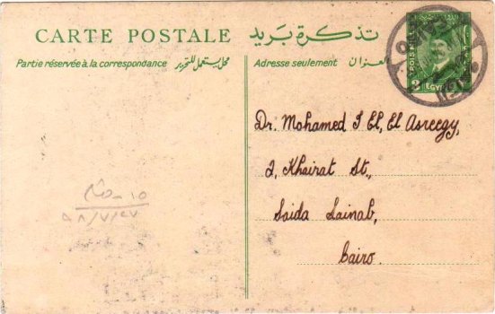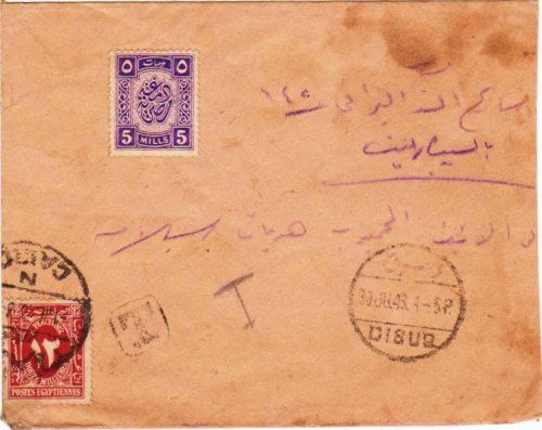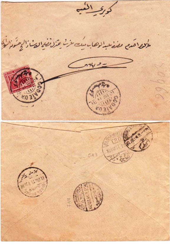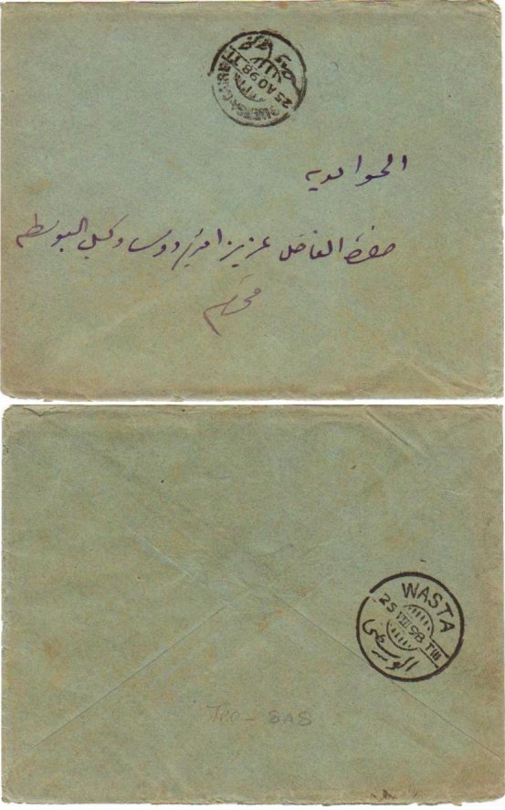 | 518 | 25 AI 98, small green cover Arabic-addressed from Guerga to Hawamdiya via Wasta (transit behind). Unfranked, but cancelled with TPO lone Guerga-Caire CDS (Type 8A8)  | £26.00 |