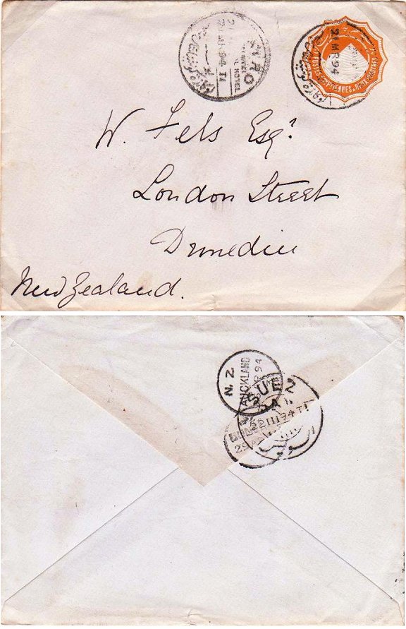 | 75 | Envelope. 1888 DLR 2pi (NP SEN3 $7, Magdi E4 $30), addressed New Zealand and cancelled with Shepheard’ s Hotel CDS HS1 of 21 MR 94. Transit marks of Suez and Auckland behind, arrived Dunedin 29 AP (39 days). Clean, neat  | £10.00 |