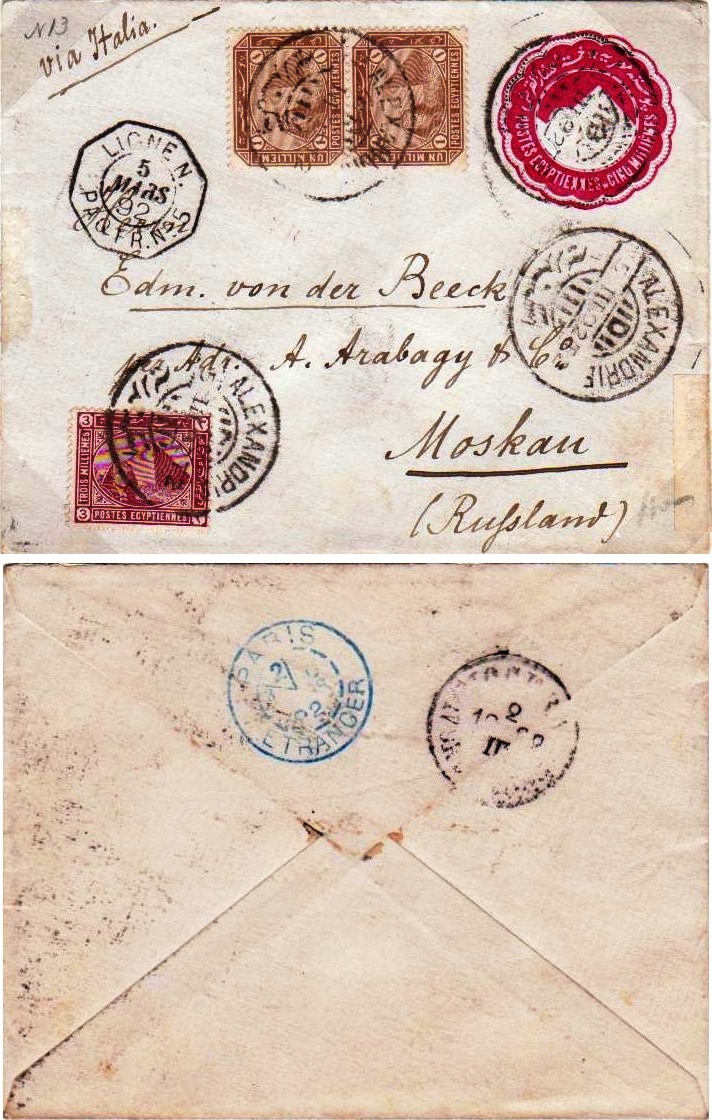 | 76 | 1889 DLR 5m (NP SEN5a $6, Magdi E9 $20), uprated with pair of DLR1m plus DLR 3m and neatly addressed to Moskau in Russland, CDS Alexandrie / D 5 III 02 and endorsed Via Italia. Transit mark of Paris (blue) and arrival in 36 days. Fascinating  | £40.00 |