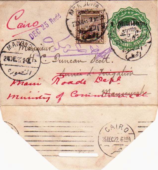 | 77 | 1913, 1m on DLR 2m printed envelope (NP SEN12 $75, Magdi E19 $80), uprated with 1m DLR, addressed in town from Mansoura 23 XII 22, but redirected in red ink to Cairo where it arrived on Christmas Day. Unusual  | £30.00 |