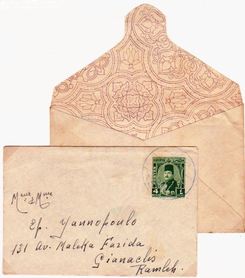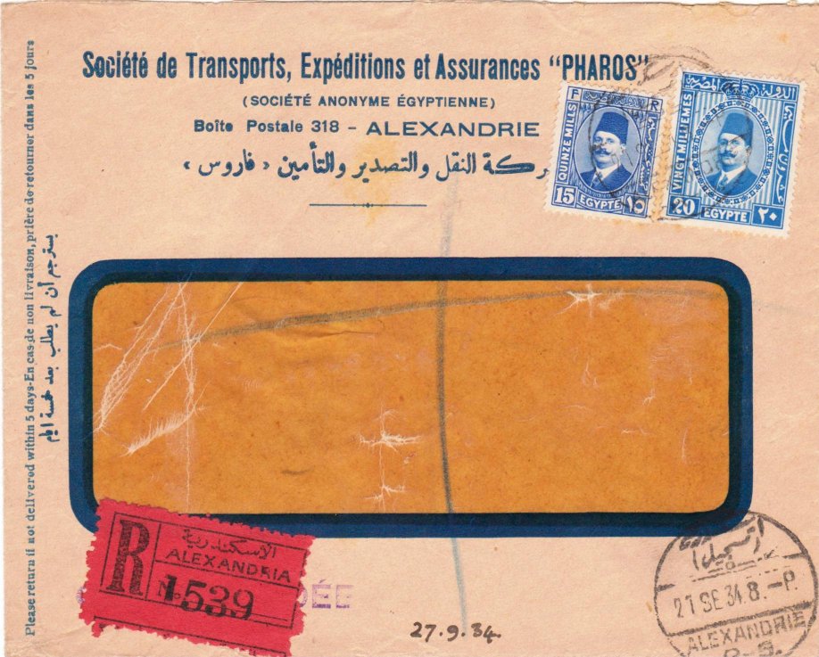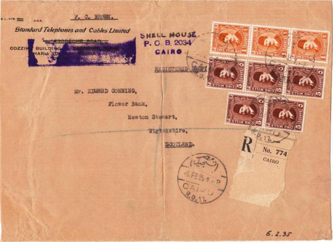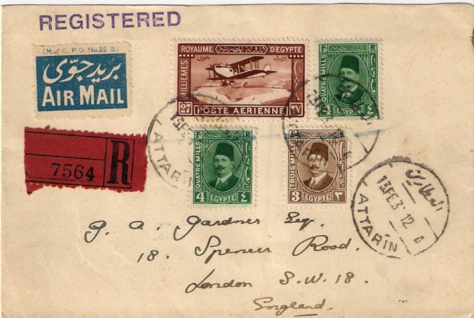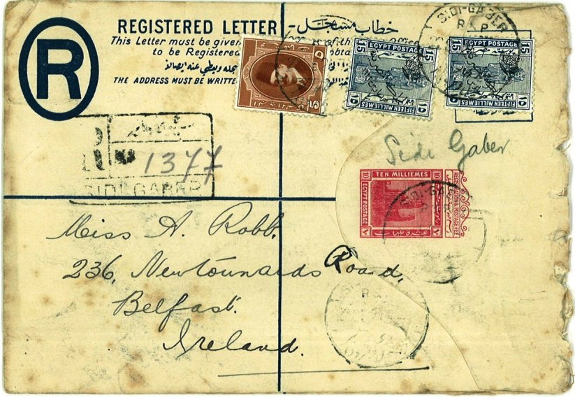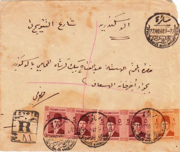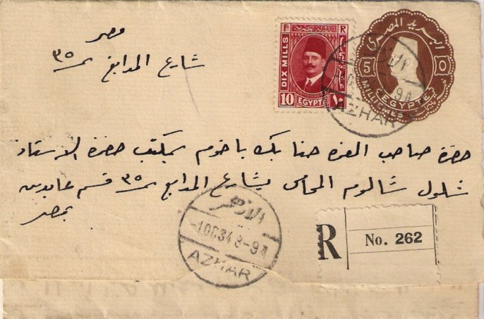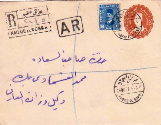 | 523 | 1936, 5m embossed Fuad envelope (NP SEN 28) uprated with 20 mill Fuad stamp for registration and AR and sent from Hadaiq el Qubba (Qubba Gardens) 24 IC 36 (Reg cachet alongside) to Mohammed Eshmawy Bey in the Ministry of Education. Two Cairo Reg markings behind. Neat and clean  | £38.00 |