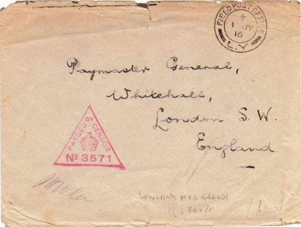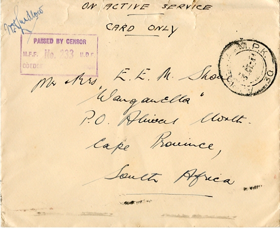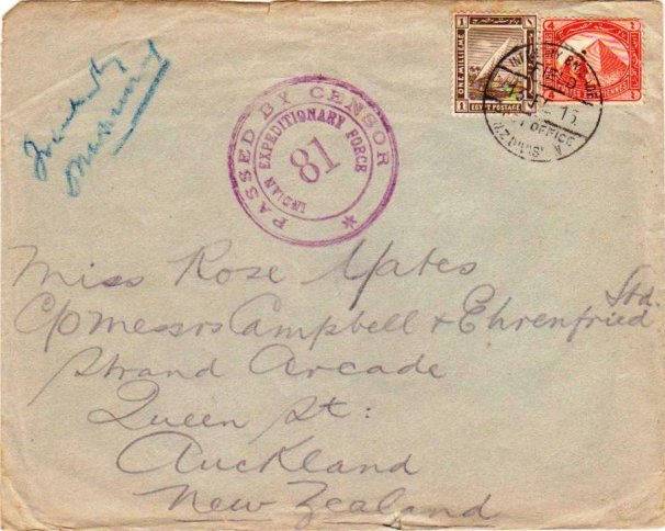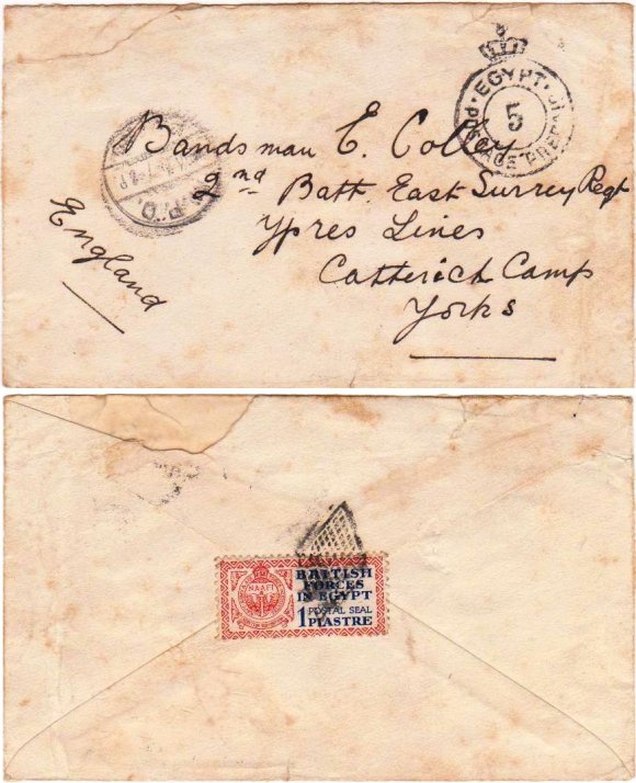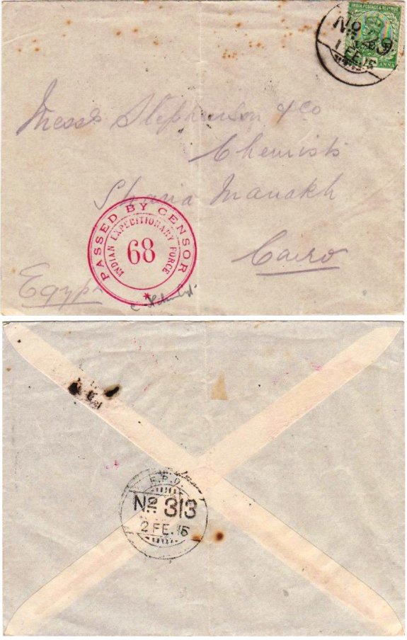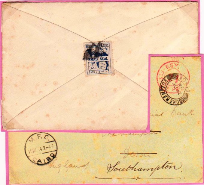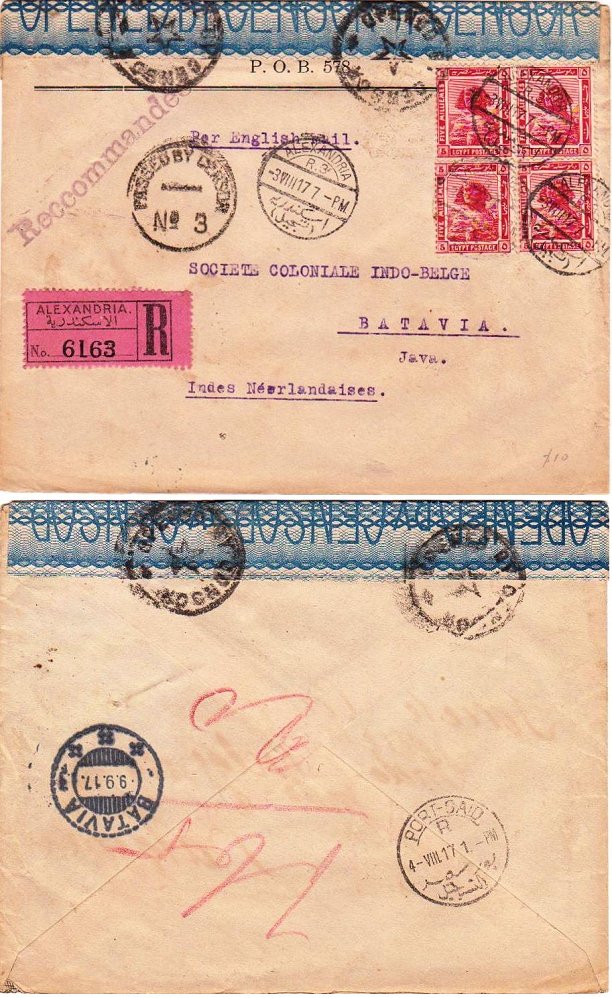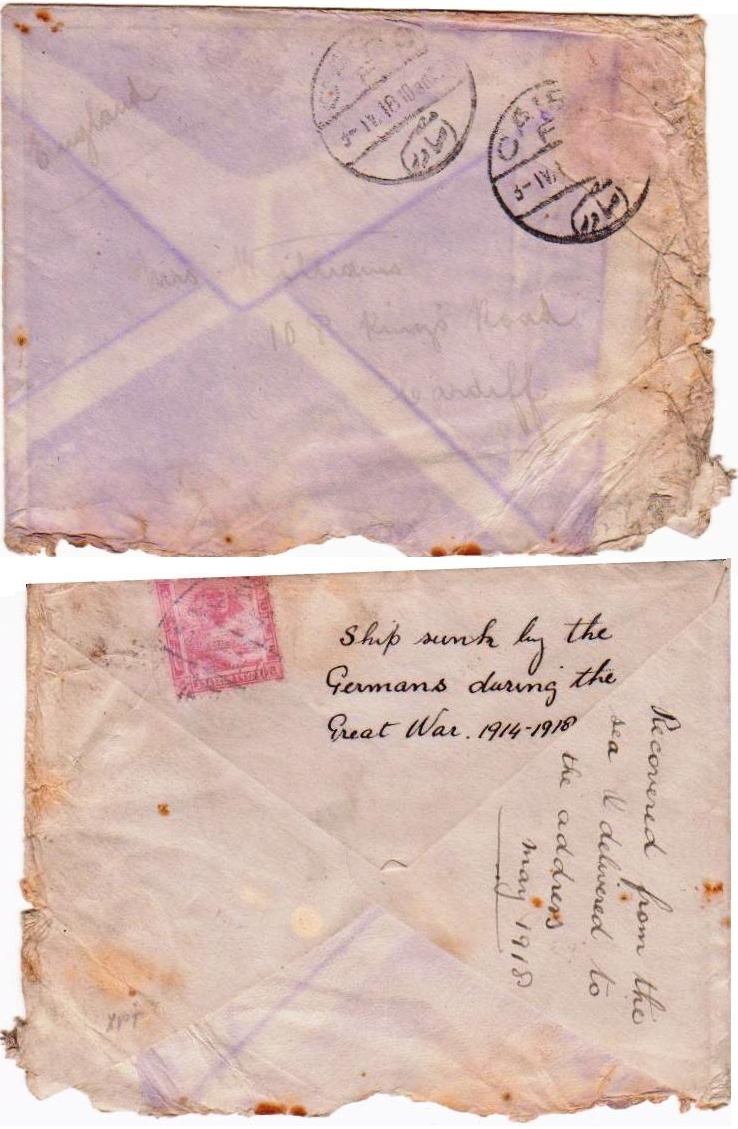 | 80 | 1918. Mysterious and badly damaged cover posted in Cairo 3 IV 18 and addressed to Mrs Williams, Kings Road, Cardiff (England). Stamp gone, but mirror-imprint of DLR 5m and other envelopes from immersion in water. Handwritten notes say "Ship sunk by Germans" and "Recovered from the sea and delivered.... May 1918". What ship? Mystery  | £35.00 |
