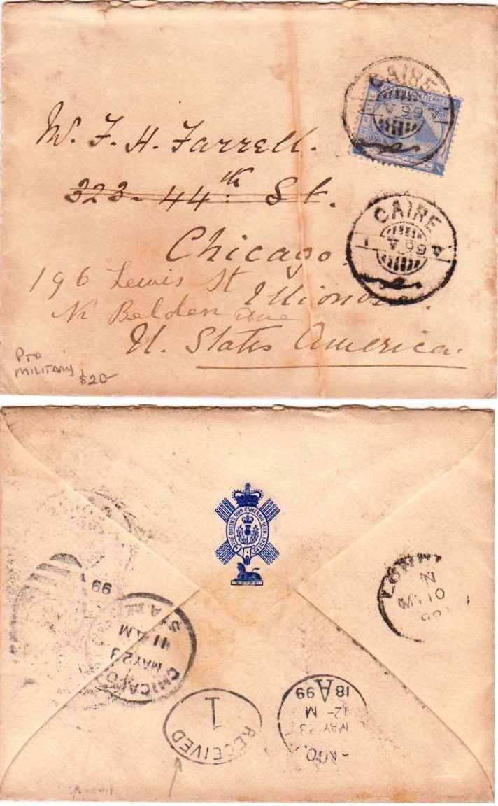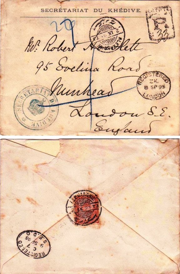| 82 | 2 IX 95, printed cover "Secretariat du Khedive" franked (on reverse) with DLR 2pi and registered for London. Large blue handstamp with Crown and Secretariat du Khedive at lower left, Alexandrie cancellation with 11 bars. London Registration on face, 8 SP 95, SEDO on reverse next day. Colourful and unusual  | £30.00 |