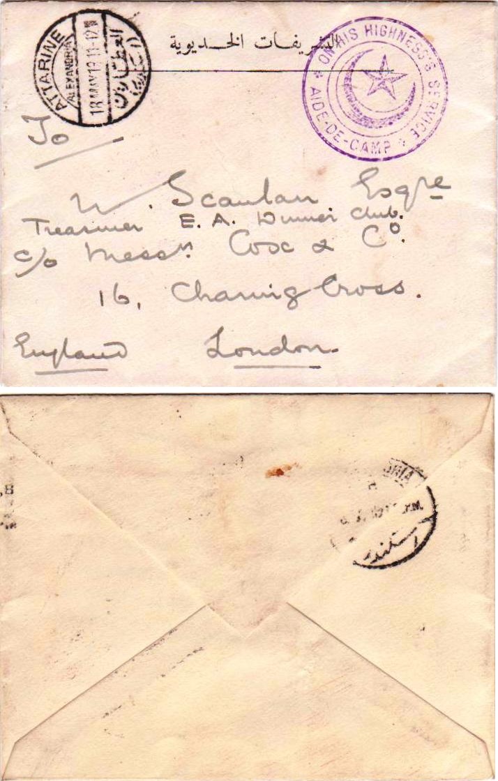 | 83 | 18 MAY 13, Arabic printed cover with violet star and crescent / Aide de camp / On His Highness’ s Service handstamp at top right, unfranked, addressed to London from Attarine/Alexandrie. Alex transit behind. Striking  | £25.00 |