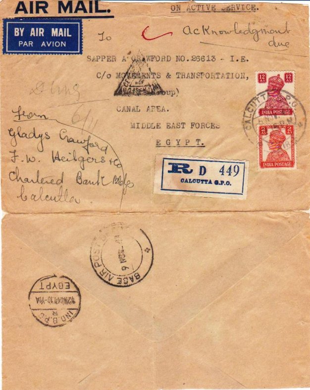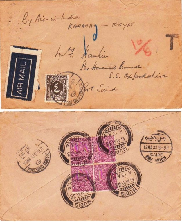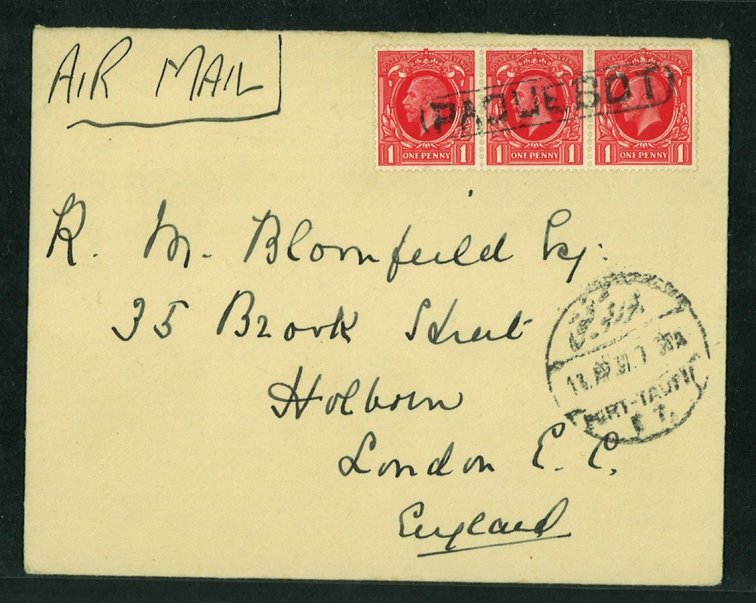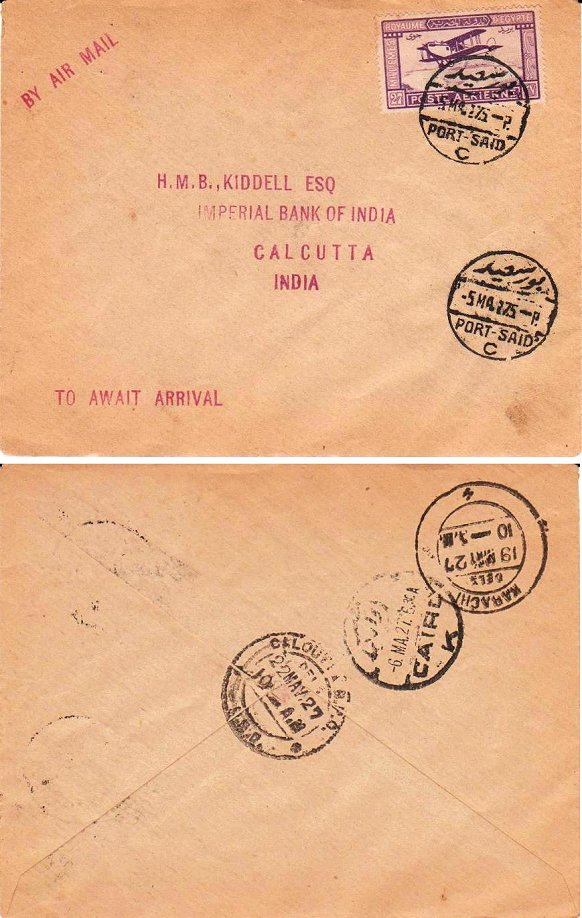 | 84 | 5 MA 27, Air Mail cover addressed to Calcutta "To wait arrival", franked with 1926 27m violet Air stamp (SG 132) and cancelled Port Said / C. Reverse has CDS of Cairo, Karachi and Calcutta. Clean and neat  | £6.00 |